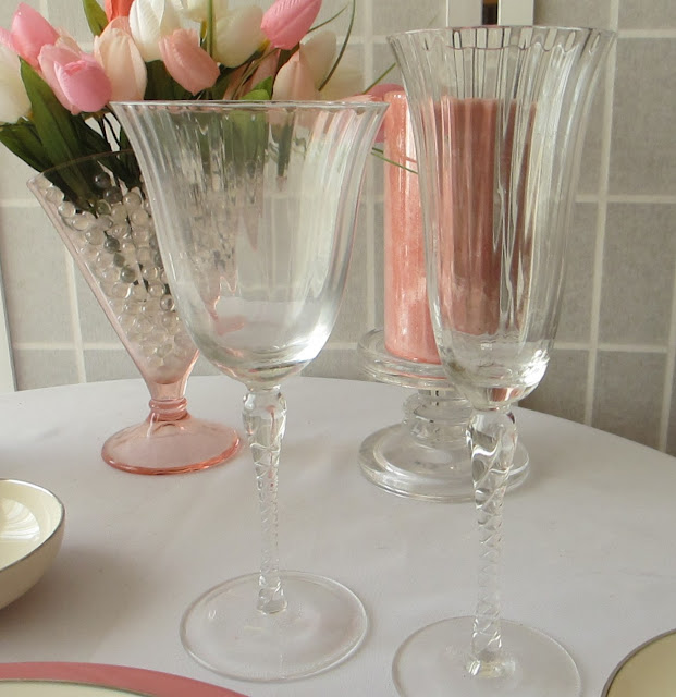 These pretty dishes have a very "mid century modern" vibe, and your table setting reflects that also. I like the restrained use of color, with only the charger and candles echoing the vibrant pink of the flowers, and the vase and centerpiece bringing in some similar shades. Once again, this is a table to which I'd be happy to sit down any time!
